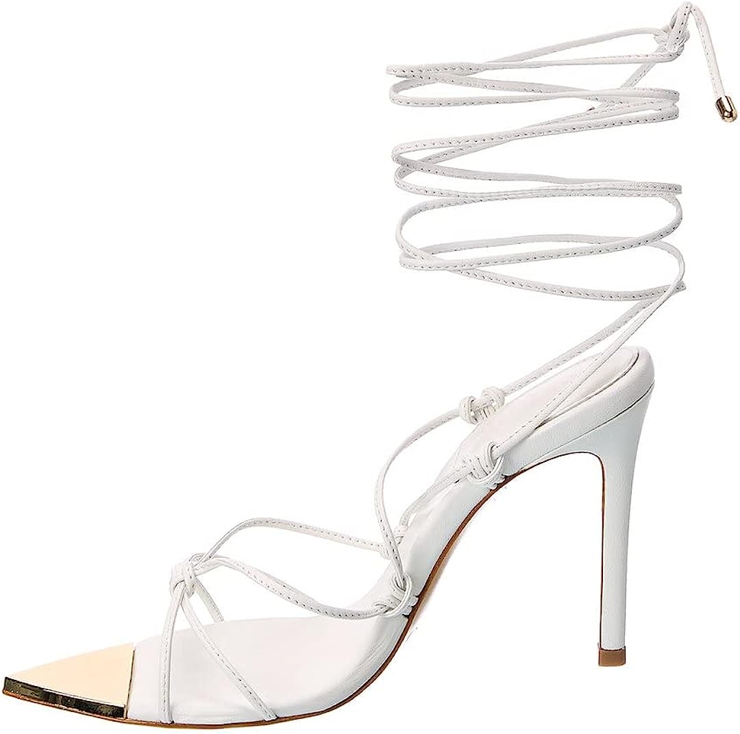 Get ready for your next night out in this sassy stiletto sandal designed with slim laces that wrap around the ankle and a metallic accent reinforcing the toe.