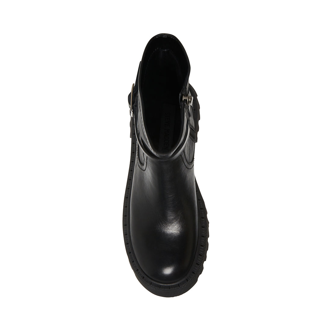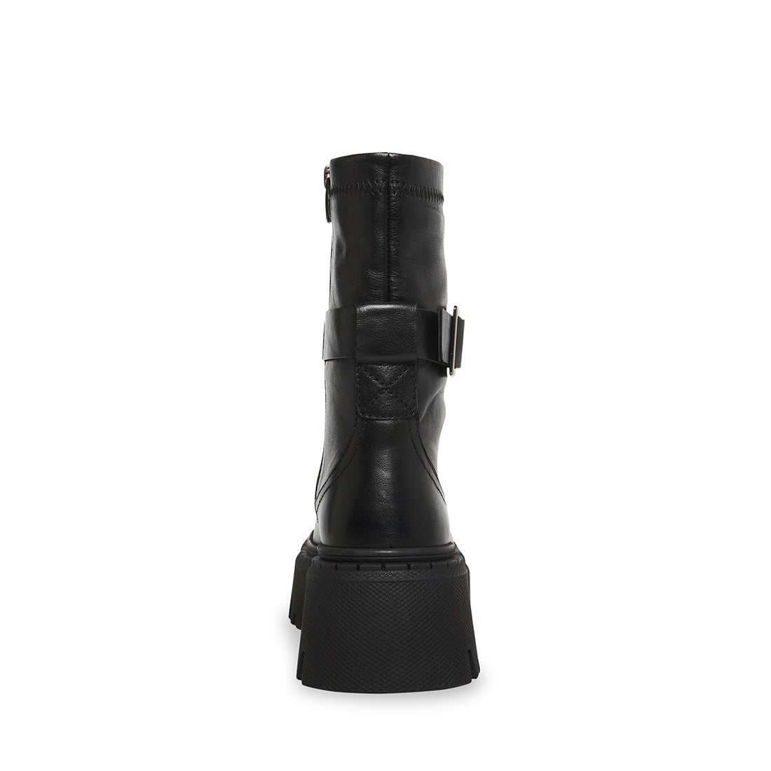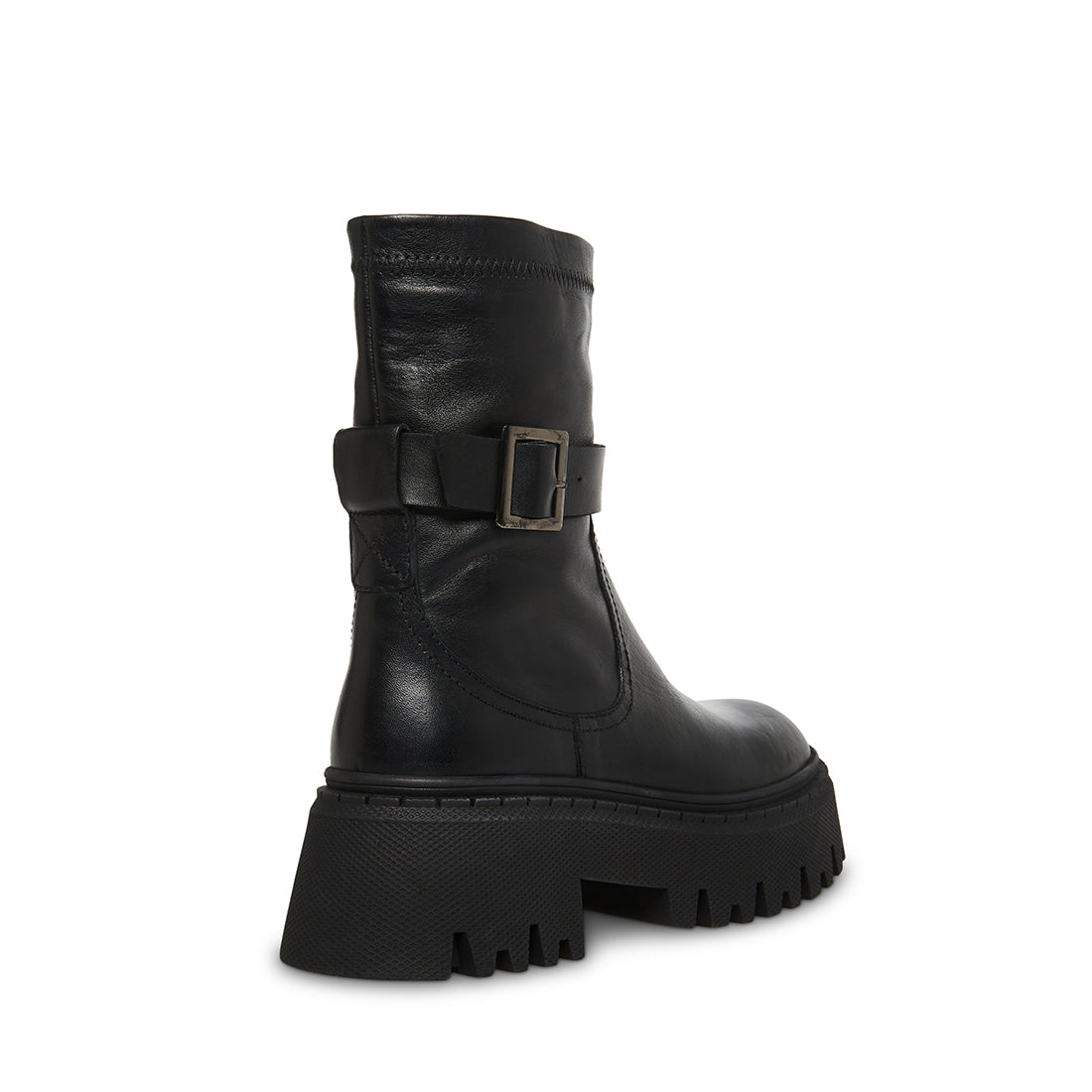 The EVERLY boot sets a luxurious leather mid calf design on a wide treadedplatformsole.
