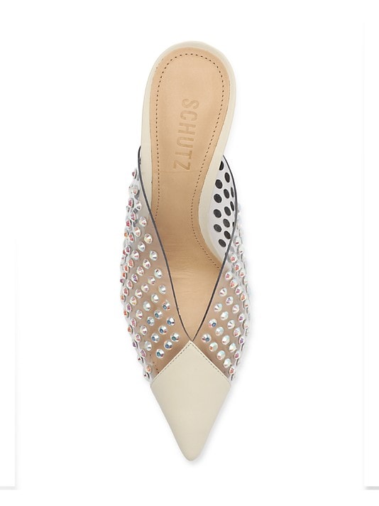 - The Greece Vinyl & Crystals Pumps features a modern mix of vinyl and leather, plus a sprinkling of studs, making it a stylish and unique addition to any shoe collection.