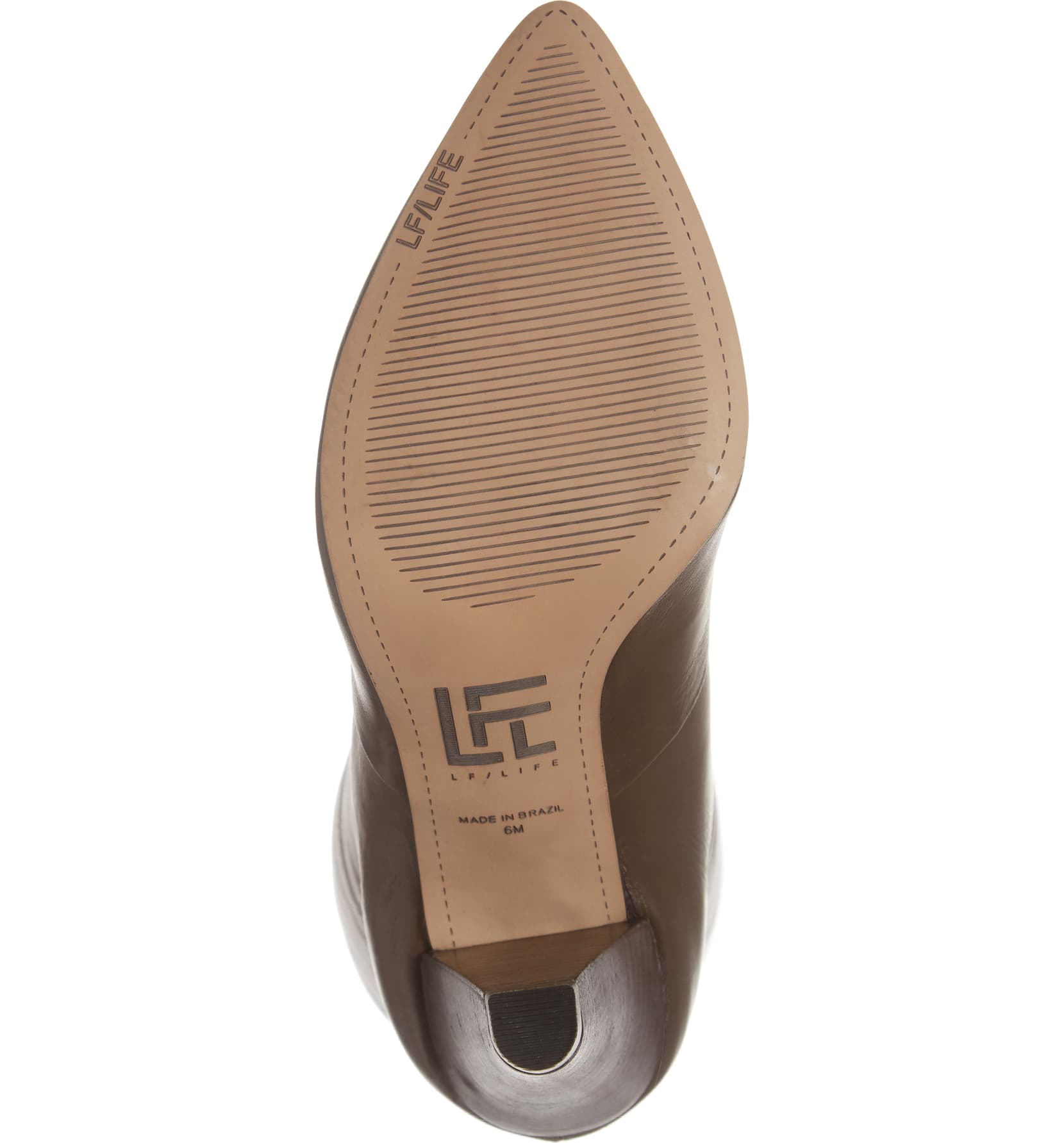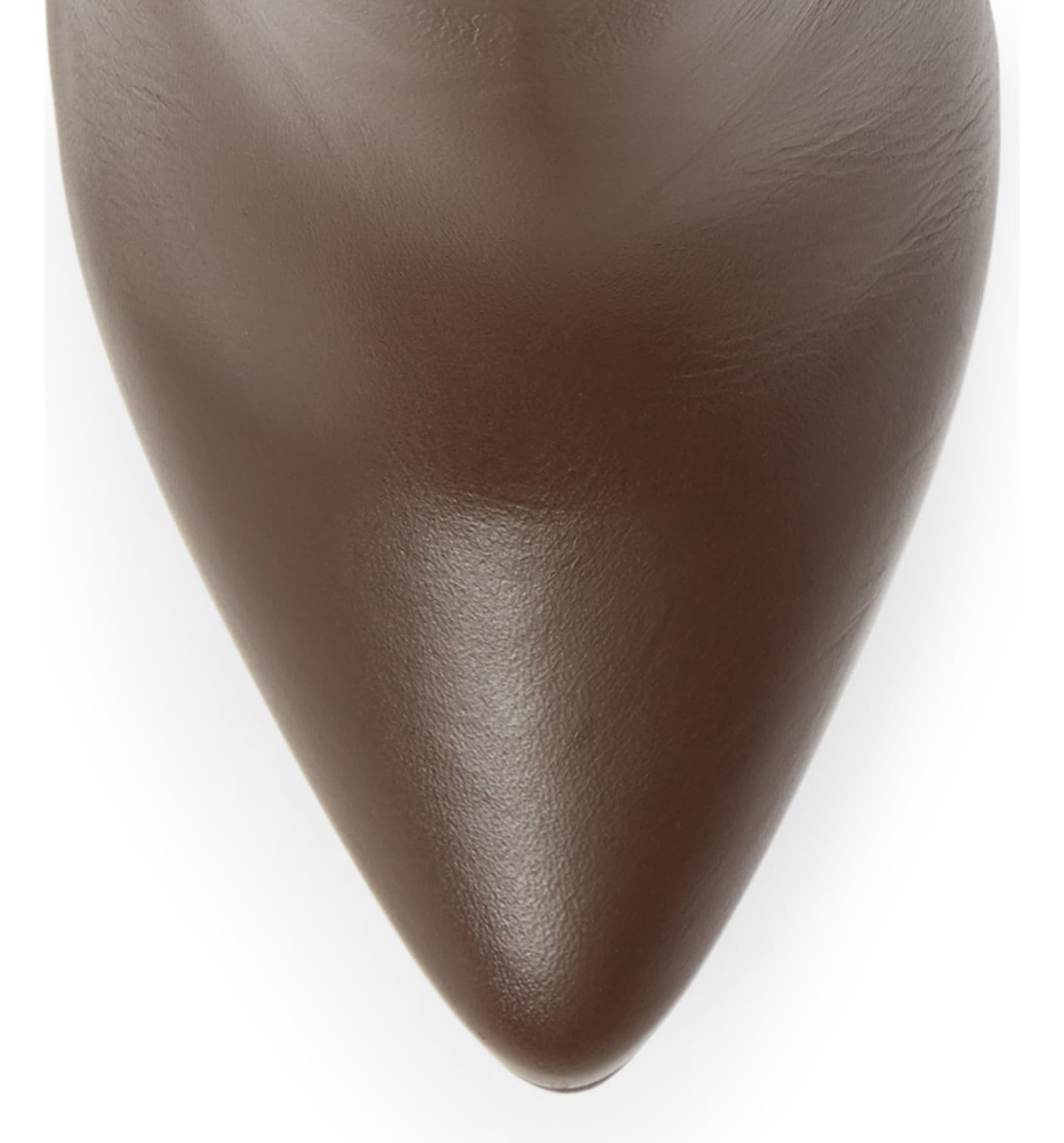 An angled topline and pointed toe lengthen the look of your leg in a comfortably cushioned boot lifted by a tapered heel.