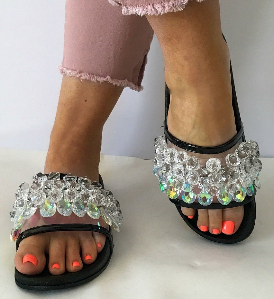 Cape Robbin Moira-63 Black Crystal Embellished Open Toe Slides Sandals Mules