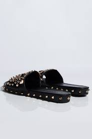 The ultimate edgy slides. This slides is embellished with pyramids, triangle and cone studs and has cone studs all around the sides.