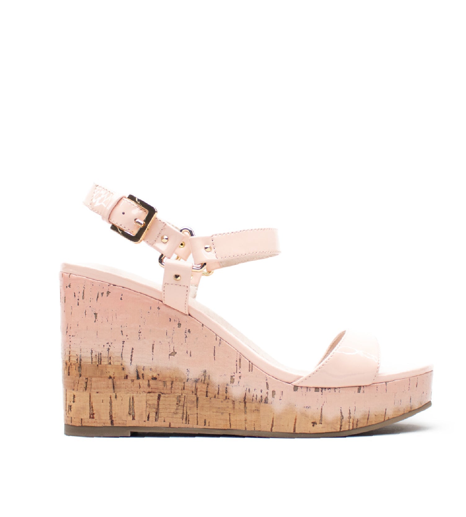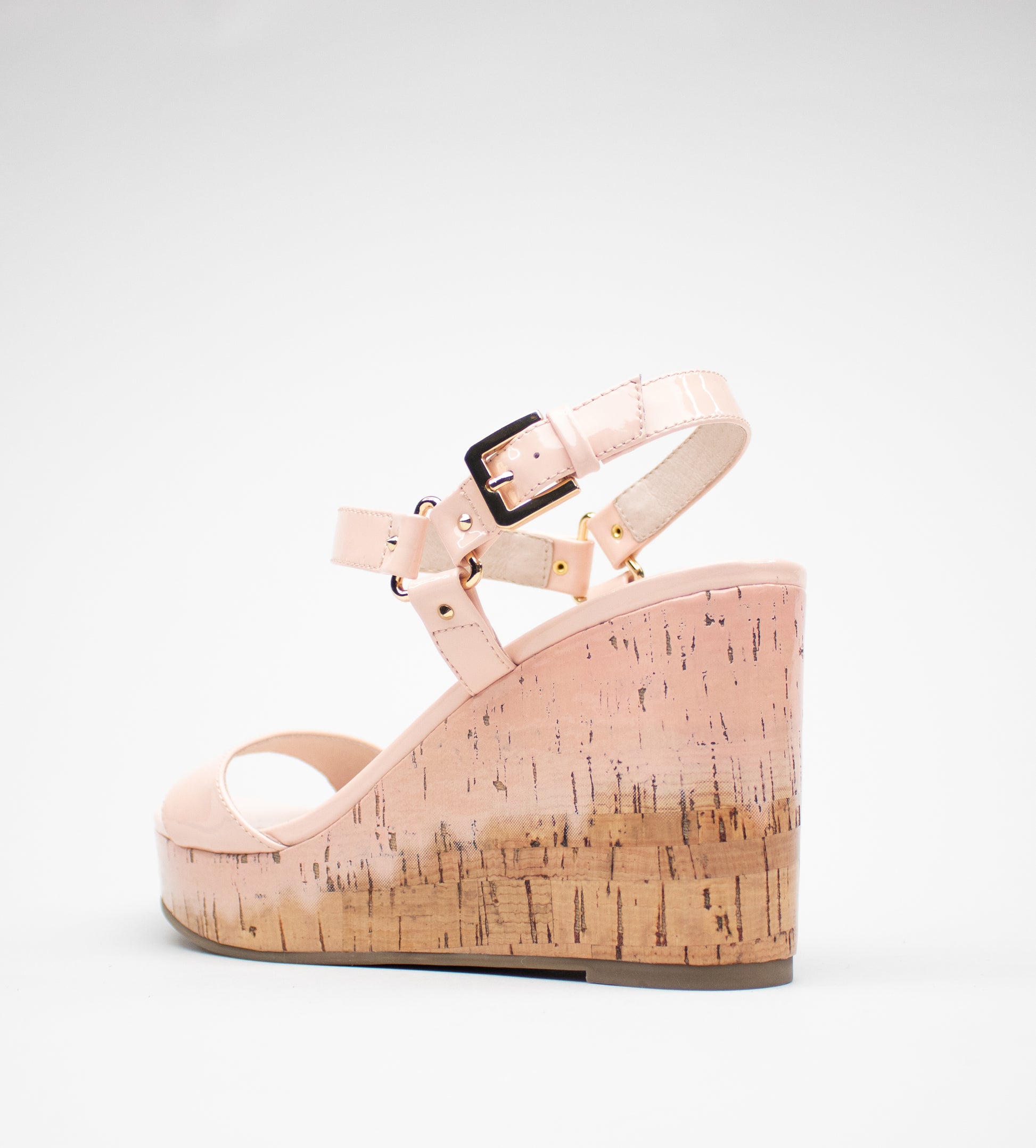 Cecelia New York Libby Pink Patent Cork Open Toe Buckle Wedge Heeled Sandals
