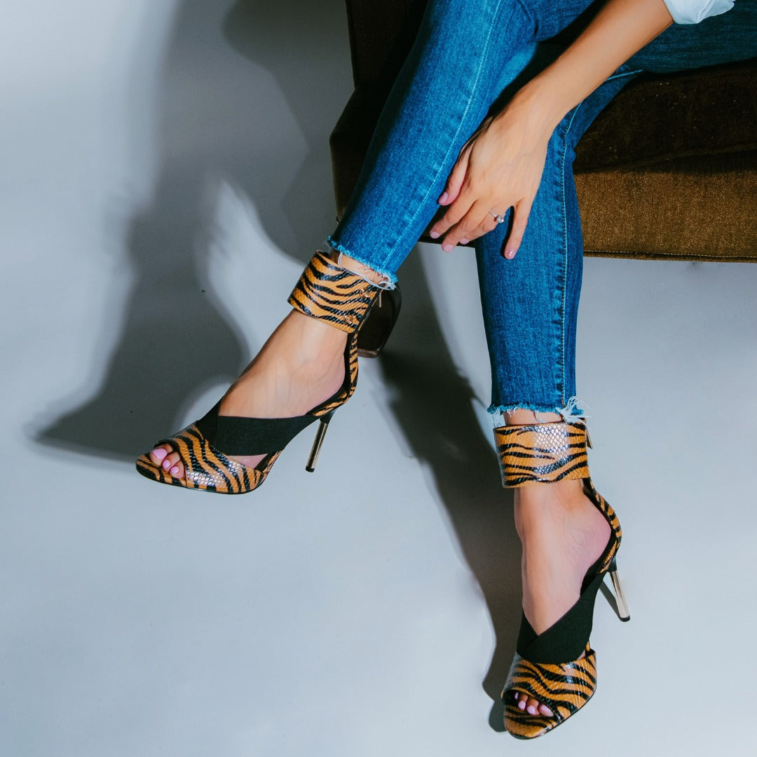 Cecelia New York Mirror Tiger Open Toe Gold Stiletto Heel Stretch Strap Sandals