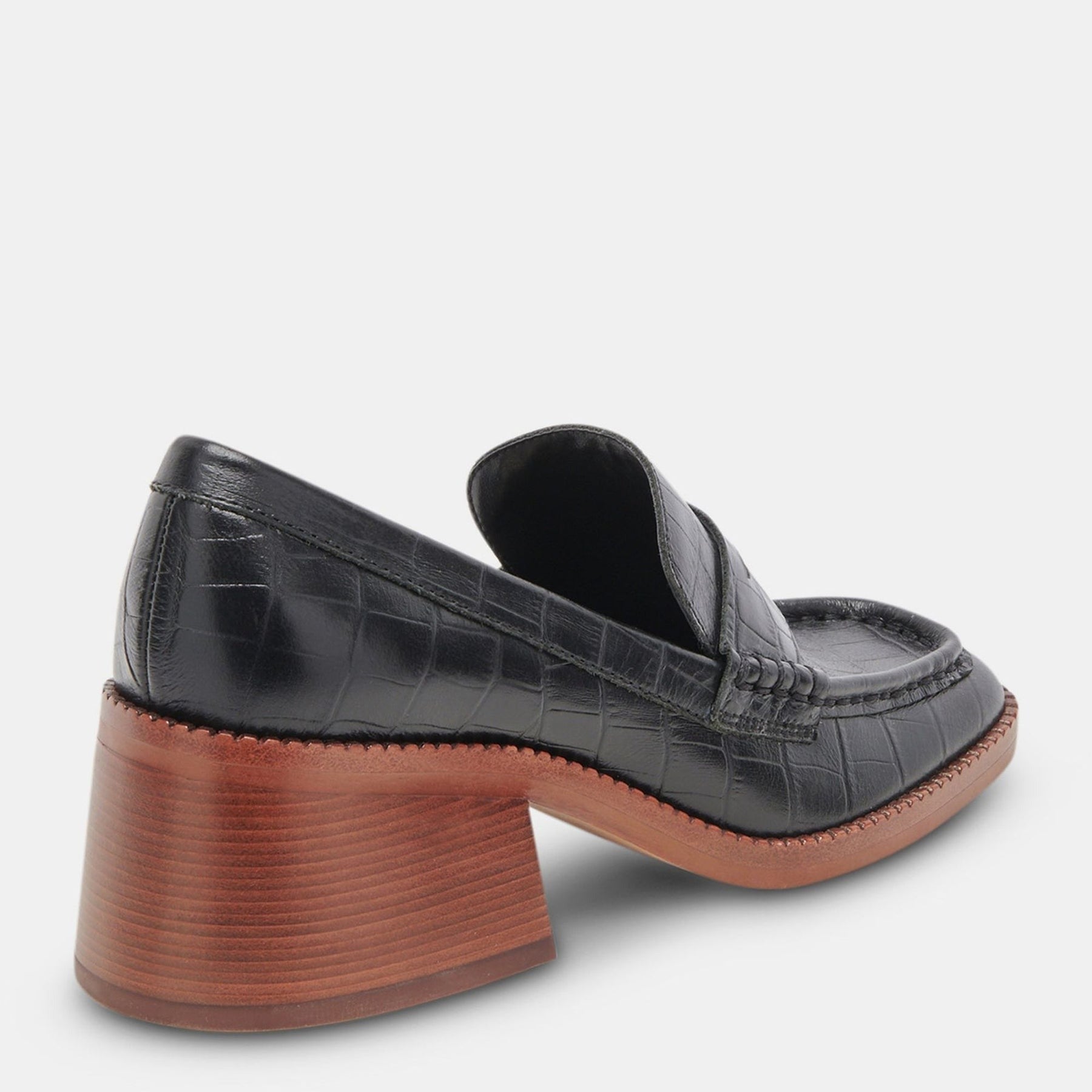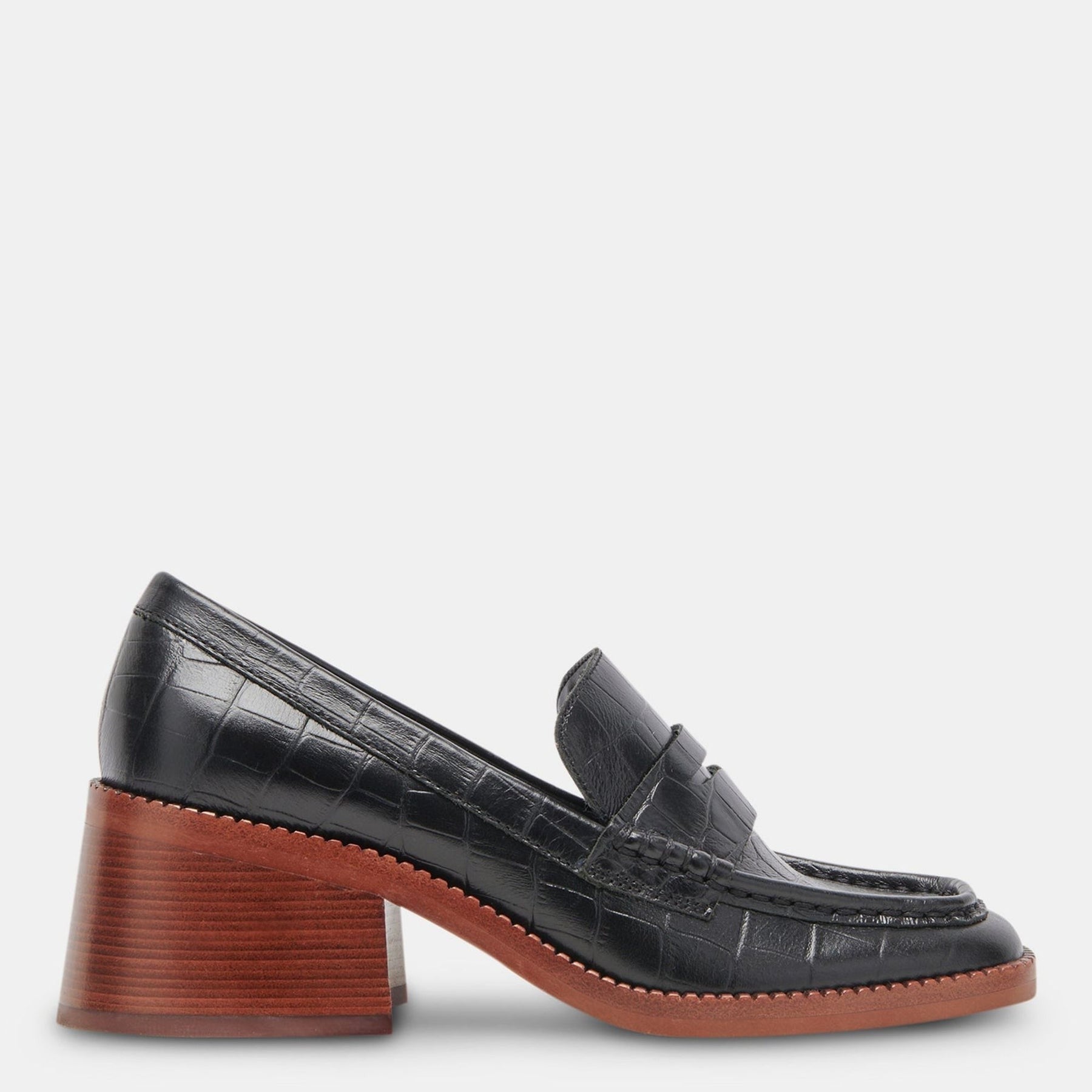 Dolce Vita Talie Noir Embossed Leather Squared Toe Slip On Block Heeled Loafers