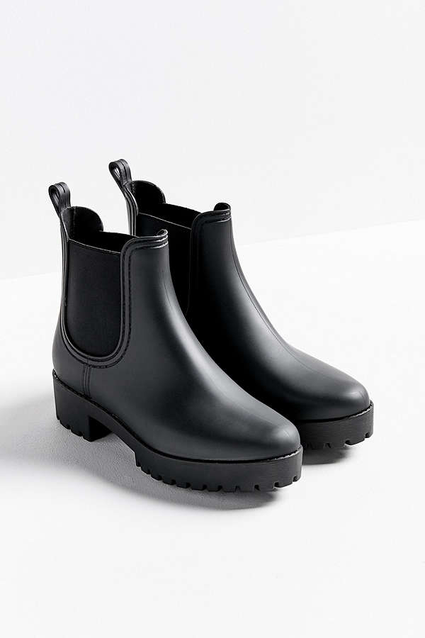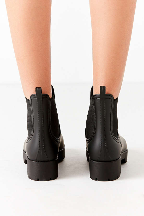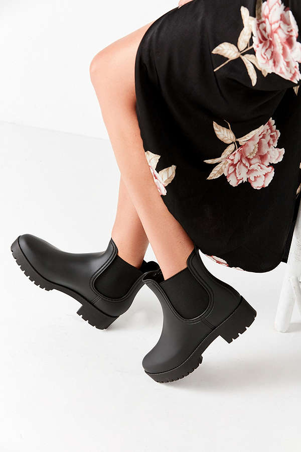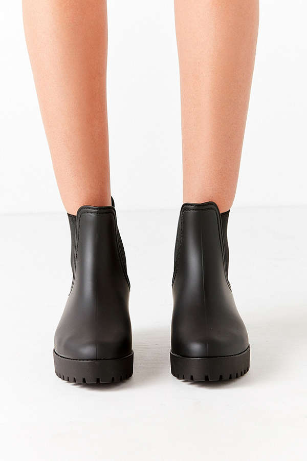 Classic Chelsea boot made rugged + rain-proof by Jeffrey Campbell. Constructed in a tough, durable, waterproof rubber and made with treaded rubber soles. Featuring an elastic panel + pull tab for an easy on/off, made with stretchy elastic gores at sides.