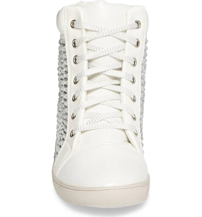 Sparkle all day in the Bassoon. A rhinestone embellished sporty high top sneaker with lace up front and 2 inch hidden wedge.