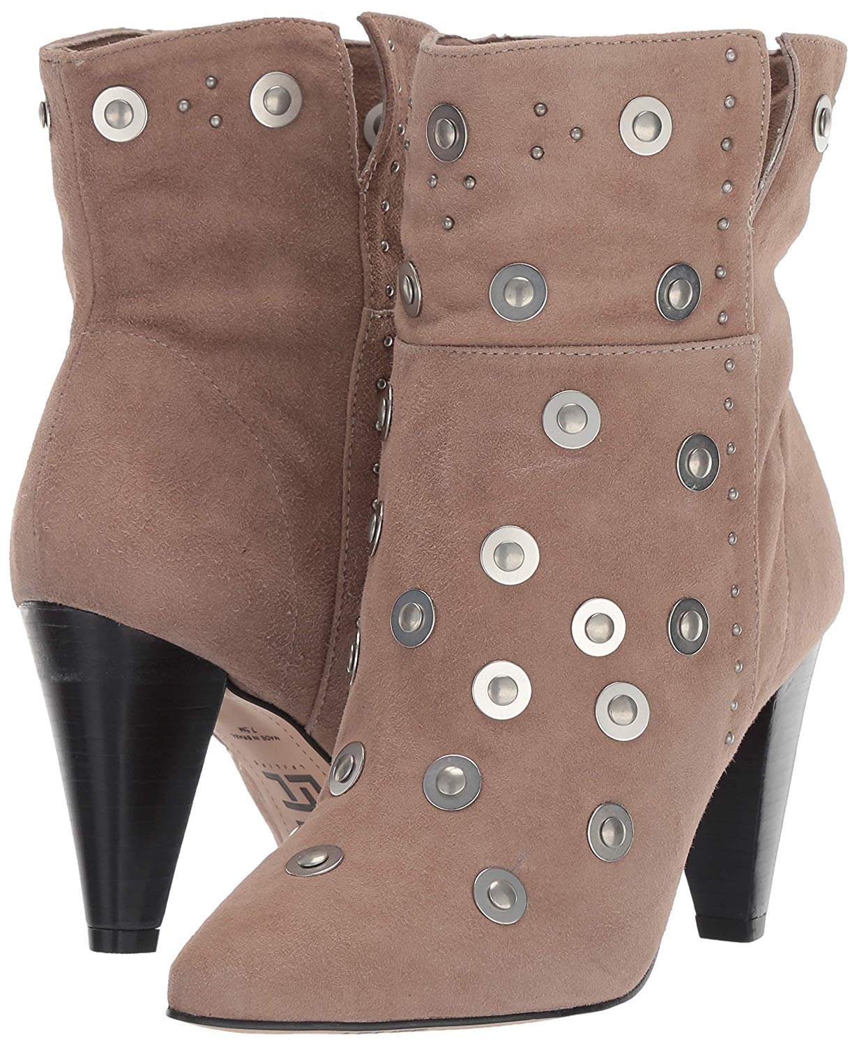 Smooth studs and gleaming washers punctuate a statement-making bootie lifted by a stacked, cone-shaped heel.