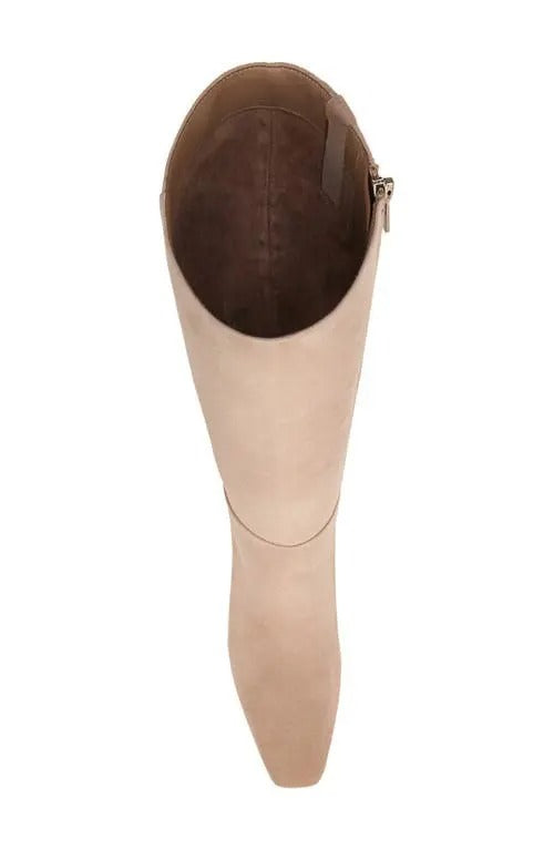 A squared-off toe elegantly finishes this tall boot shaped from fine suede and elevated on a low covered heel.