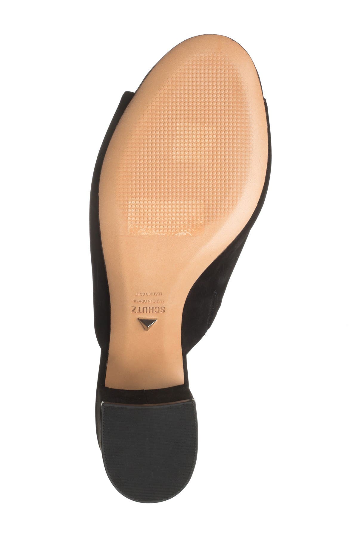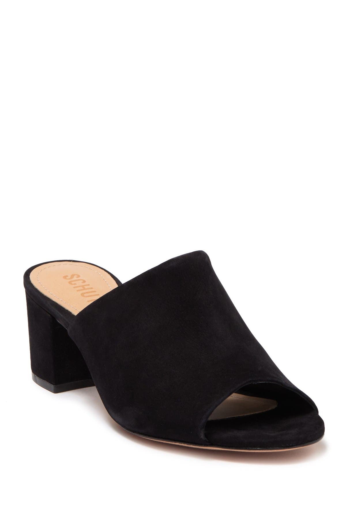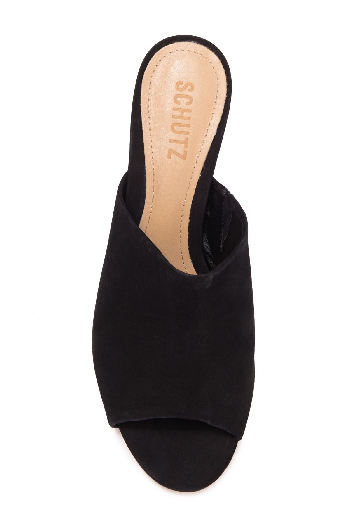 A covered block heel adds sturdy lift to these suede Schutz mules. Lightly padded footbed and leather sole.