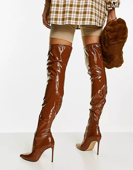 Steve Madden Viktory Cognac Patent Over the Knee Stiletto Heel Pointed Toe Boots