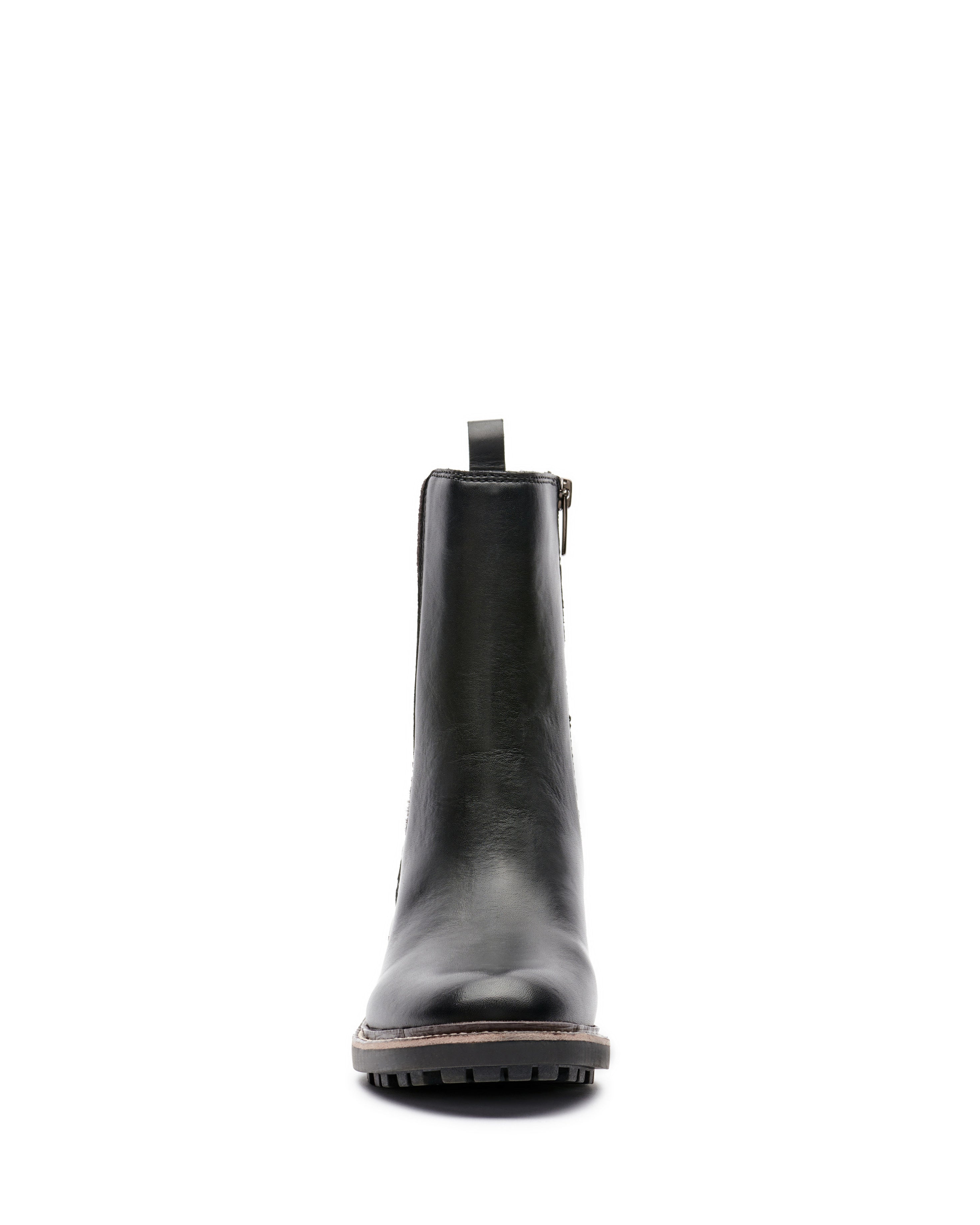 - Round toe; elasticized ribbed panels; pull tab at back; block heel with rand; lug sole