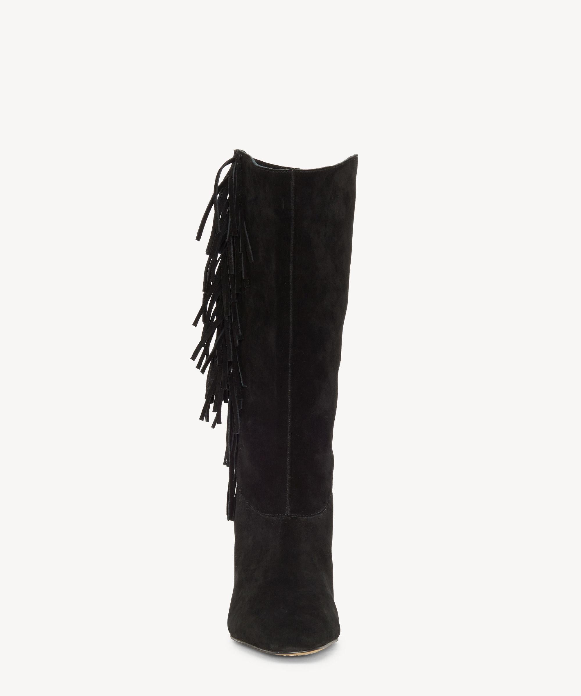 Fringe is having a moment as seen in these Western-vibe mid-calf boots. Styled with a curved topline and squared toe, the boots sit on a sleek architecturally-inspired heel. Wear yours with a denim midi skirt and tank top.