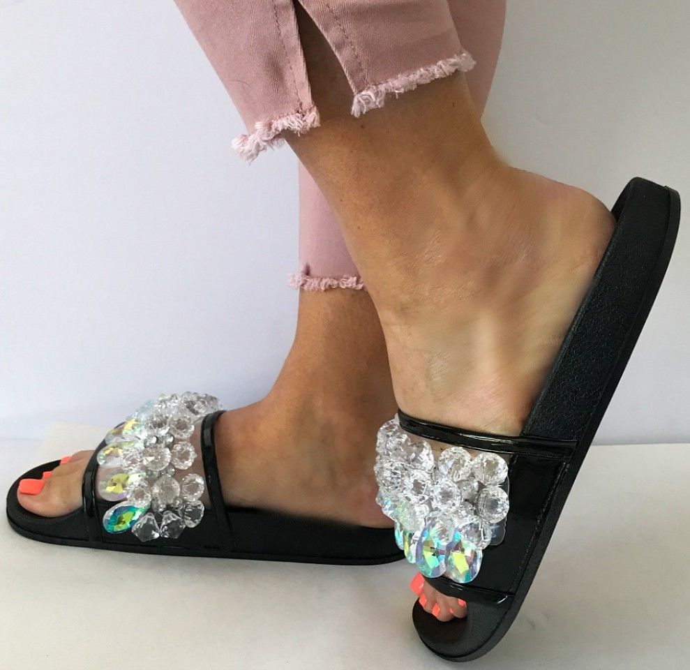 Cape Robbin Moira-63 Black Crystal Embellished Open Toe Slides Sandals Mules