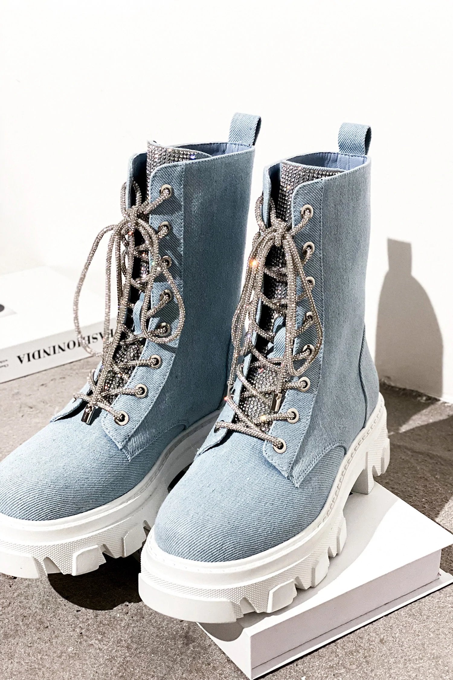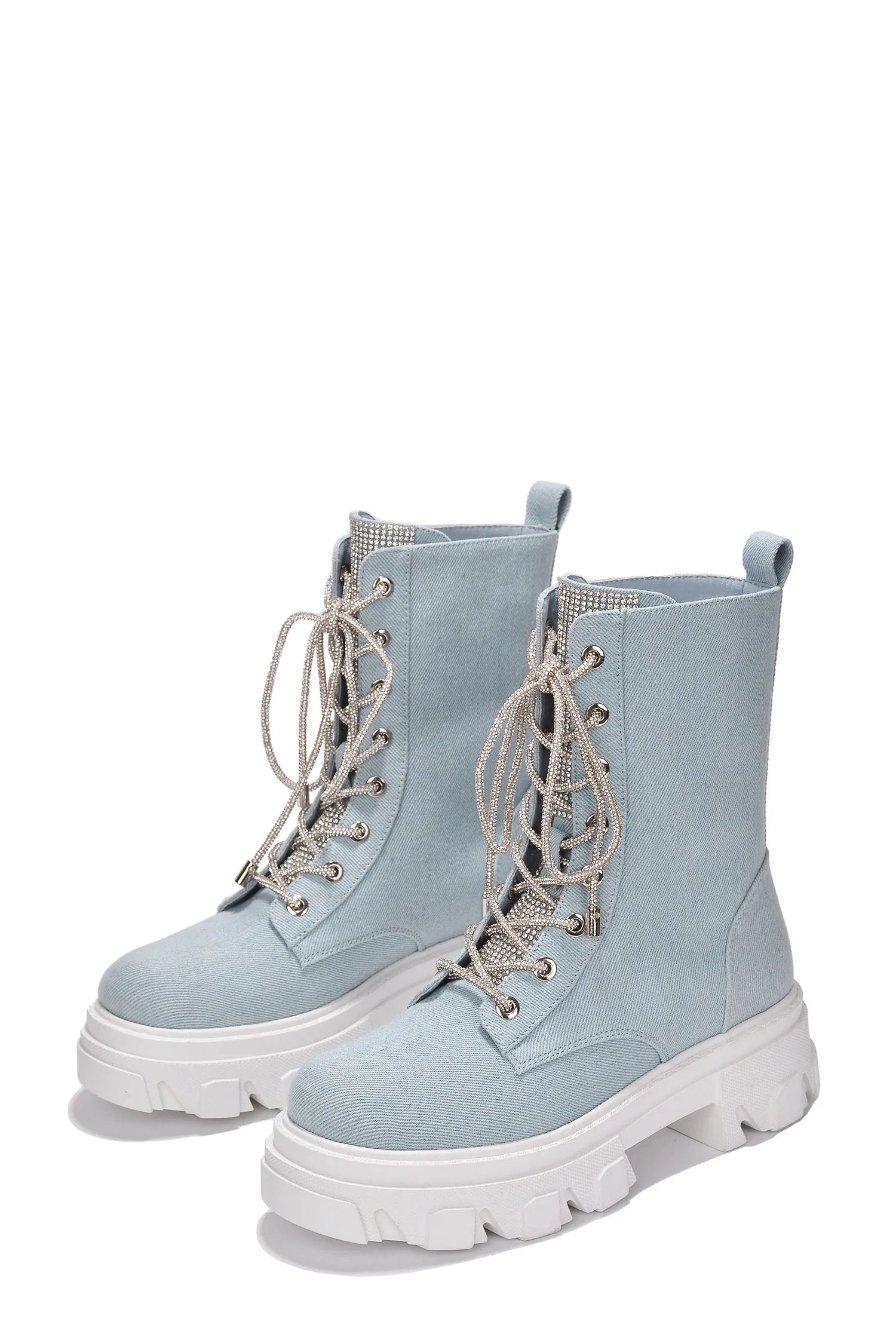 Cape Robbin Nunani Denim Lace Up Chunky Lug Sole Rounded Toe Ankle Combat Boots