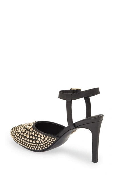 A frenetic mix of polished studs surges across the vamp of this exquisite ankle-strap sandal, bringing a pinch of punk energy to the red carpet.