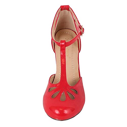 Chase & Chloe Kimmy-36 Teardrop Cut Out T-Strap Mid Heel Dress Pumps Red Patent