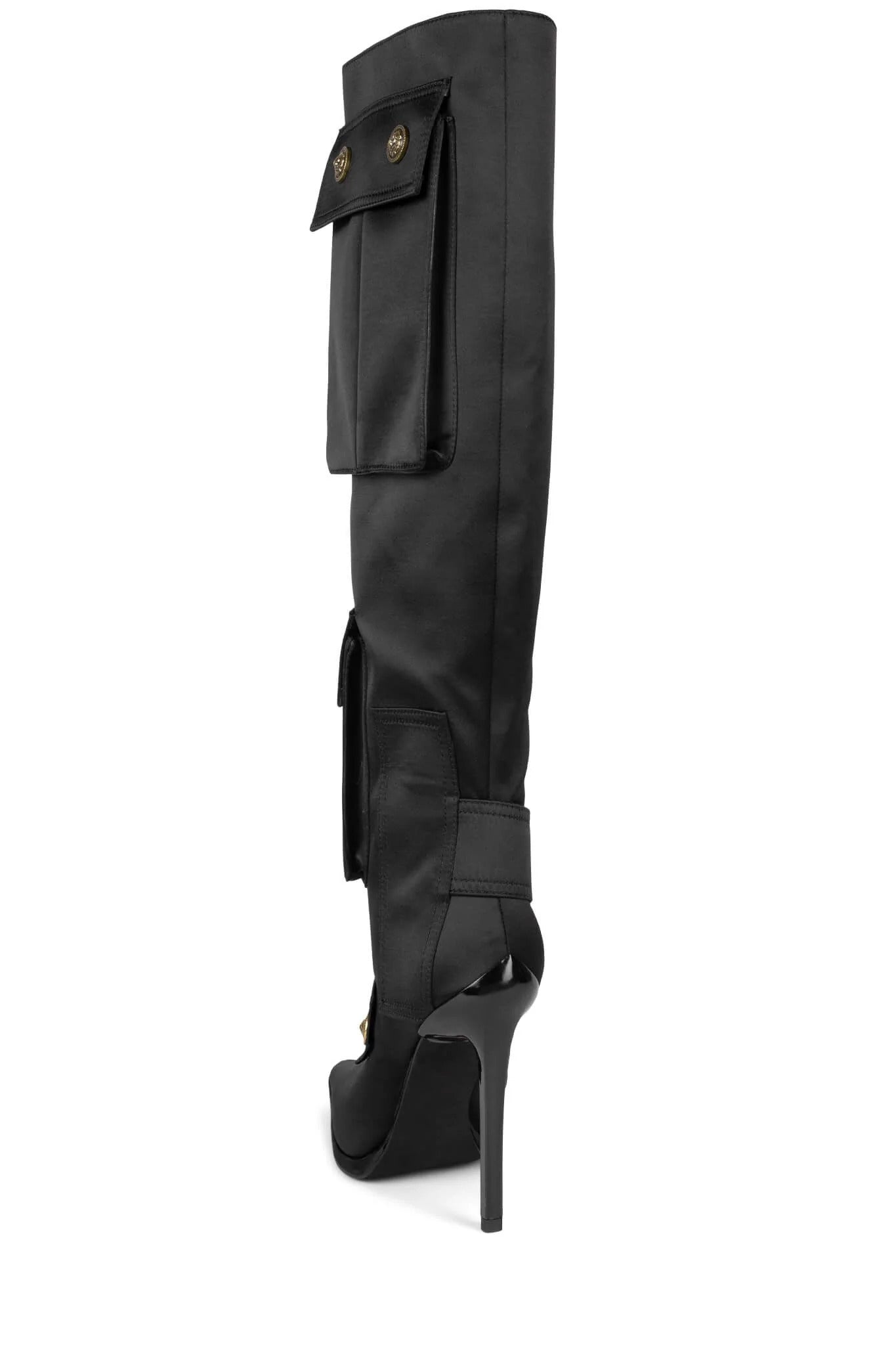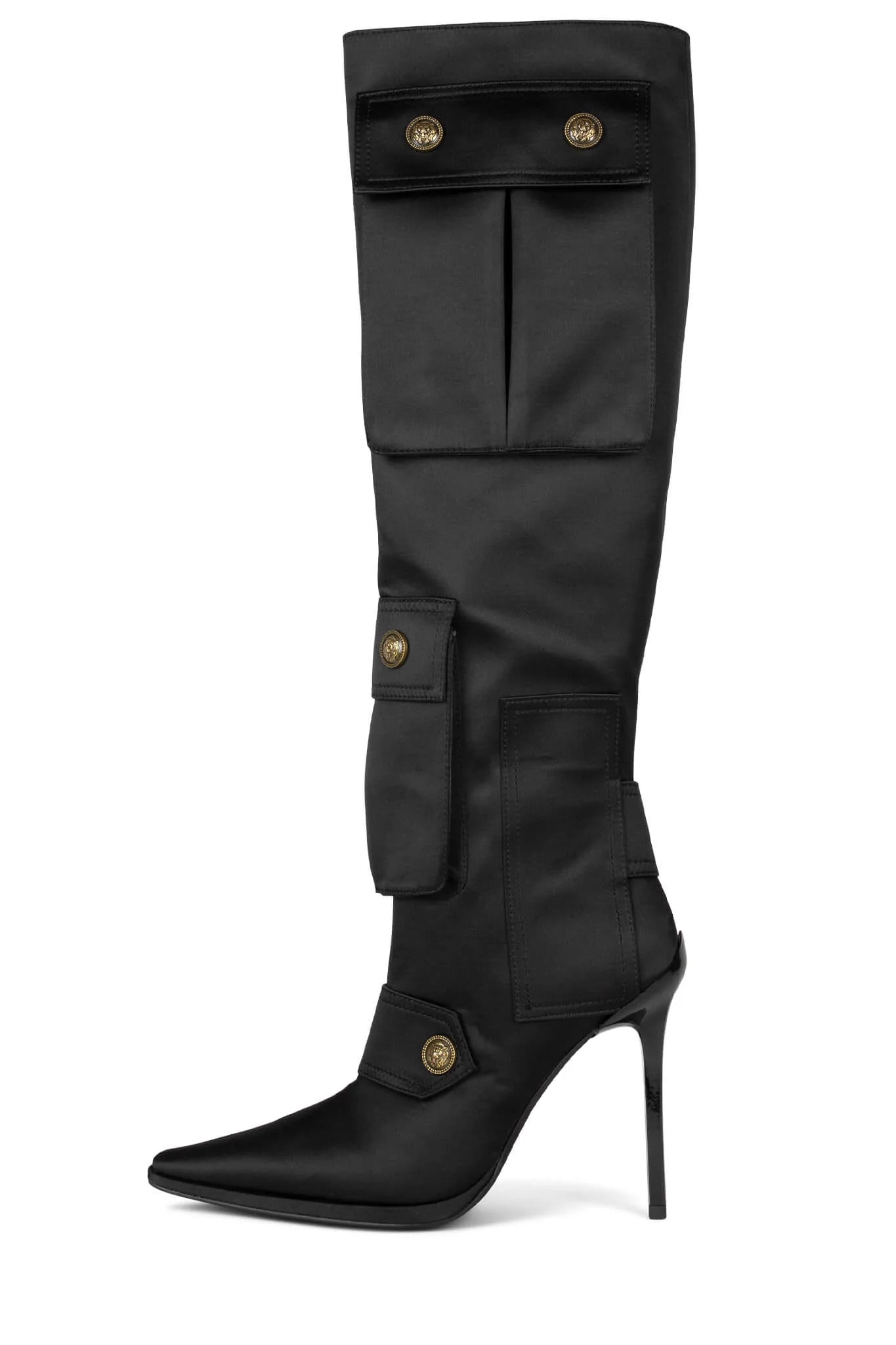 Jeffrey Campbell Pocketed Black Satin Stiletto Heel Embellished Pointed Toe Boot