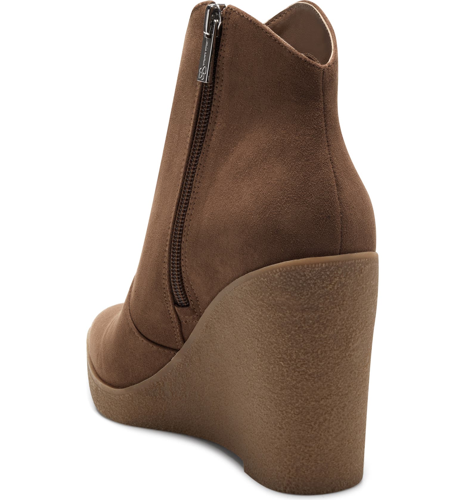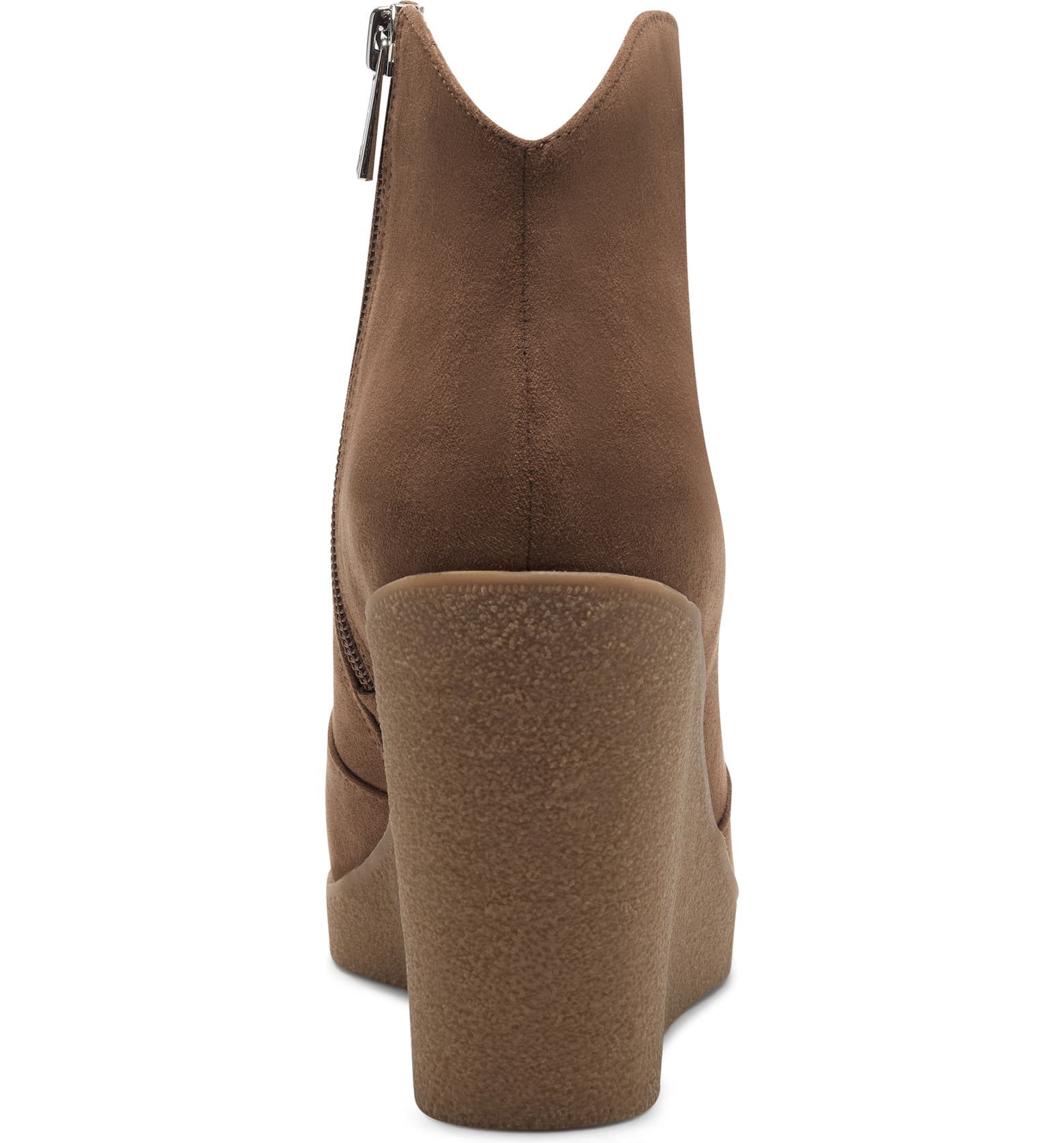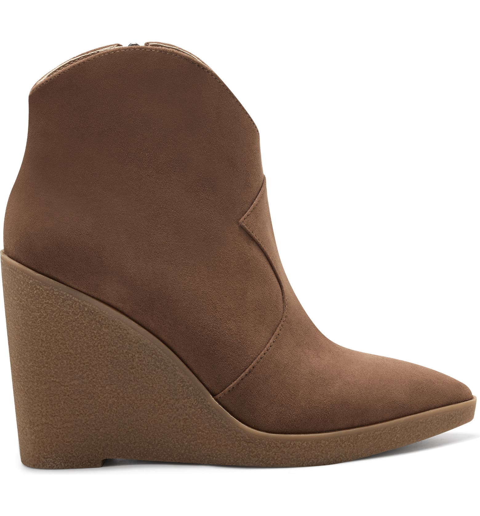 - A textured wedge brings leg-lengthening elevation to this pointy-toe bootie featuring a notched topline and convenient side zip closure.