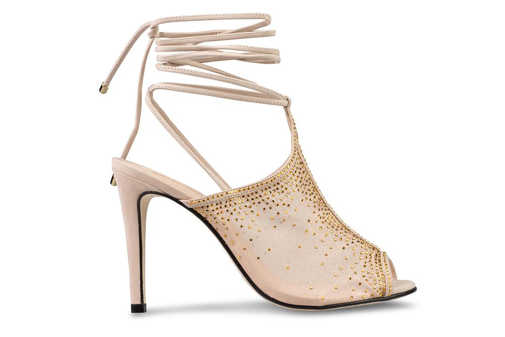 The Margeaux high heel sandal is sexy and stunning! The sheer nude colored mesh is accented by crystals giving the sandal an elegant and sophisticated look. The soft nubuck straps can be wrapped around your ankles and tied either in front, in back or to the side of your ankle depending on the outfit you are wearing. A must this upcoming holiday season.