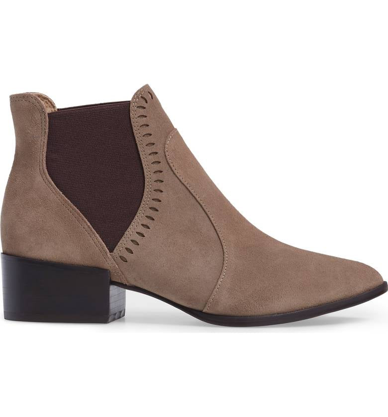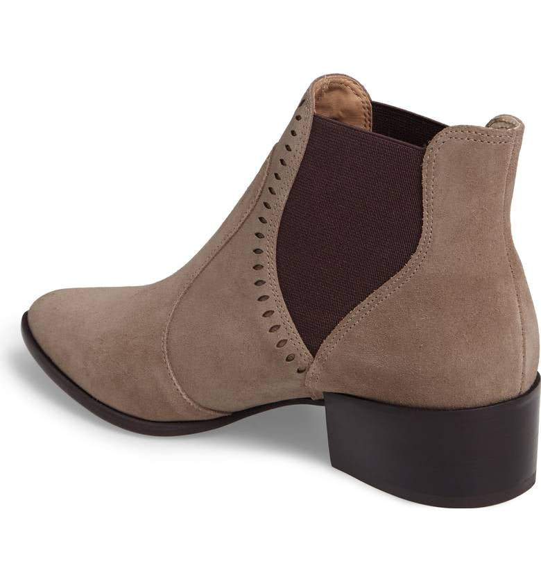 - Curvy goring panels and diamond-shaped perforations bring shape and texture to an updated pointy-toe Chelsea bootie grounded by a chunky stacked heel.