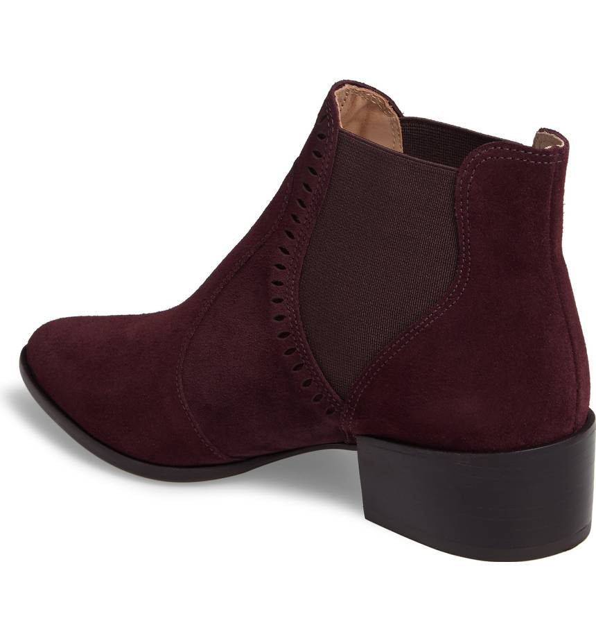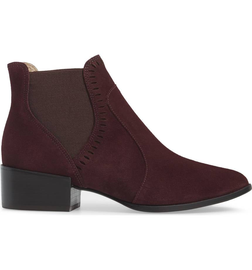 - Curvy goring panels and diamond-shaped perforations bring shape and texture to an updated pointy-toe Chelsea bootie grounded by a chunky stacked heel.