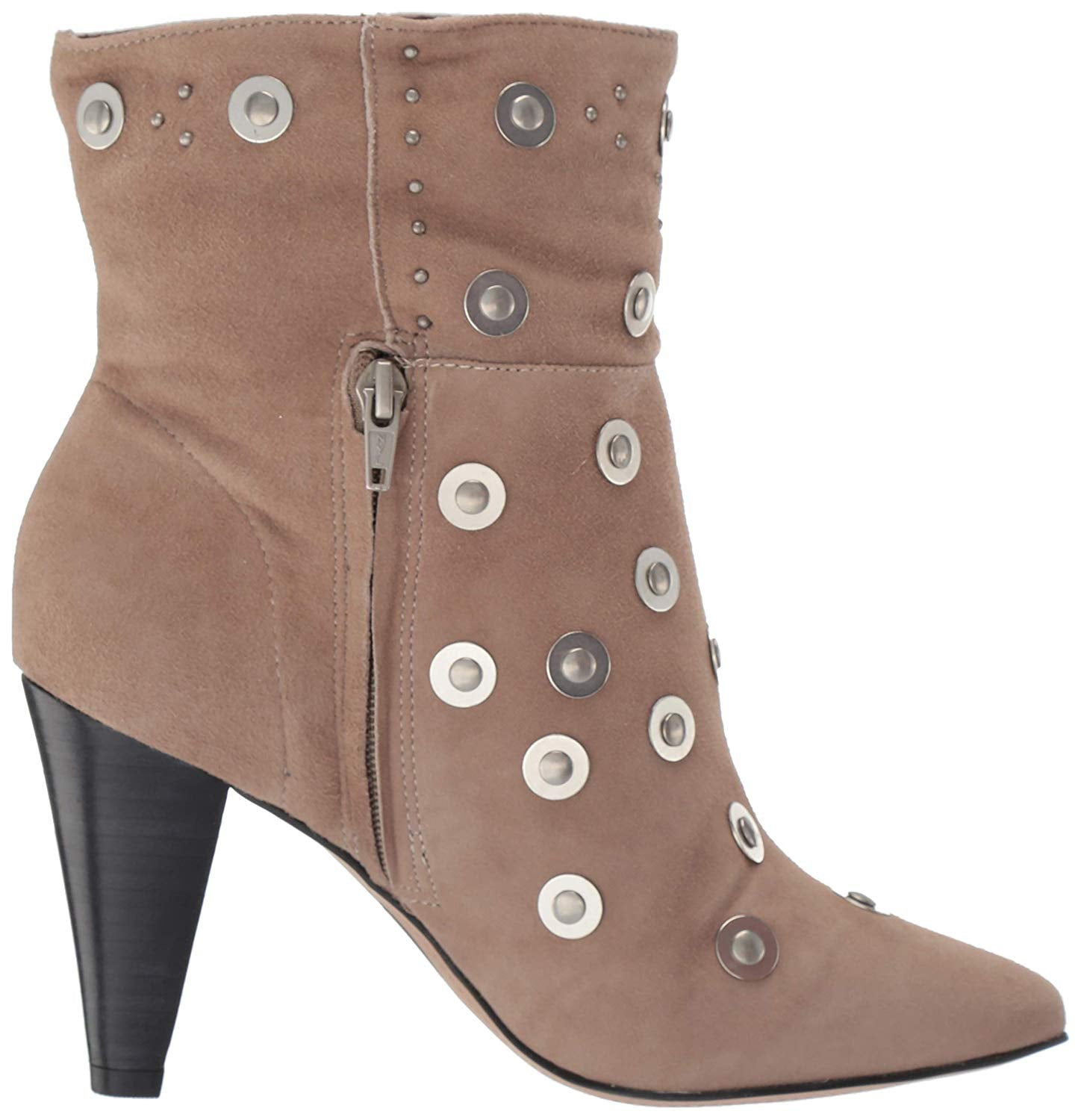 Smooth studs and gleaming washers punctuate a statement-making bootie lifted by a stacked, cone-shaped heel.