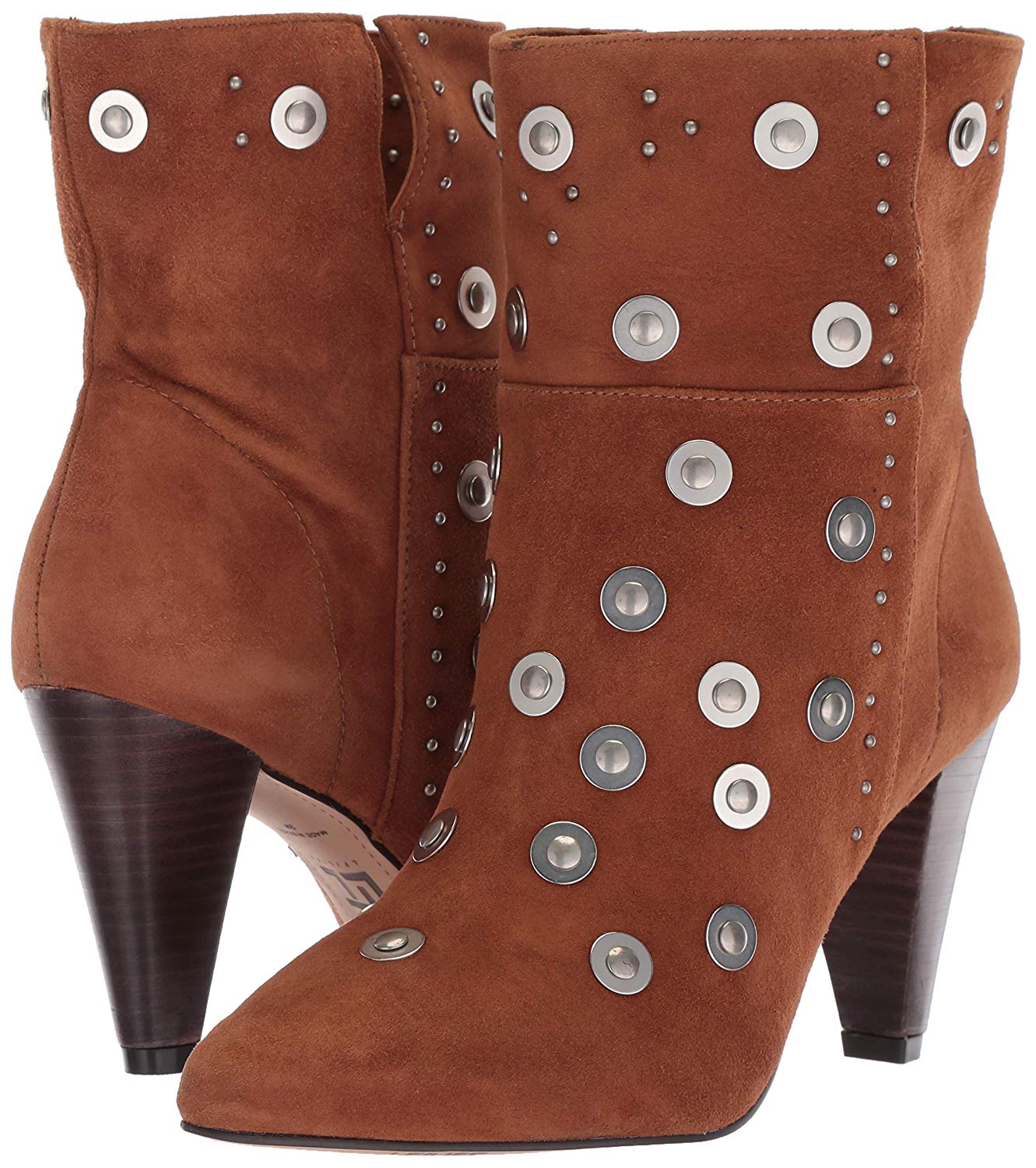 Smooth studs and gleaming washers punctuate a statement-making bootie lifted by a stacked, cone-shaped heel.