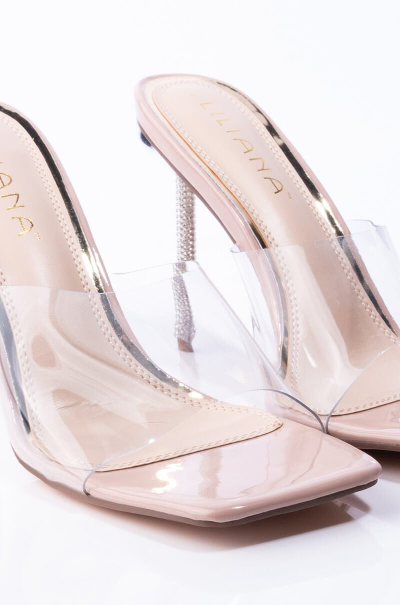 Cant deny it, cant pretend. We know these mules are the one. The Cant Deny It Stiletto Slip On Sandal features a PVC footband, a cushioned footbed, a needle thin rhinestone-encrusted stiletto heel, and a square-toe design. Style with satin dresses for a romantic, feminine vibe.