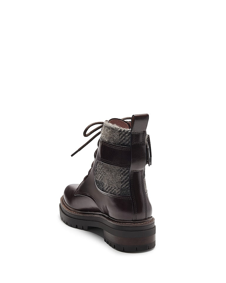 - Round toe; lace-up shaft; geo buckle hardware; lug platform and sole
