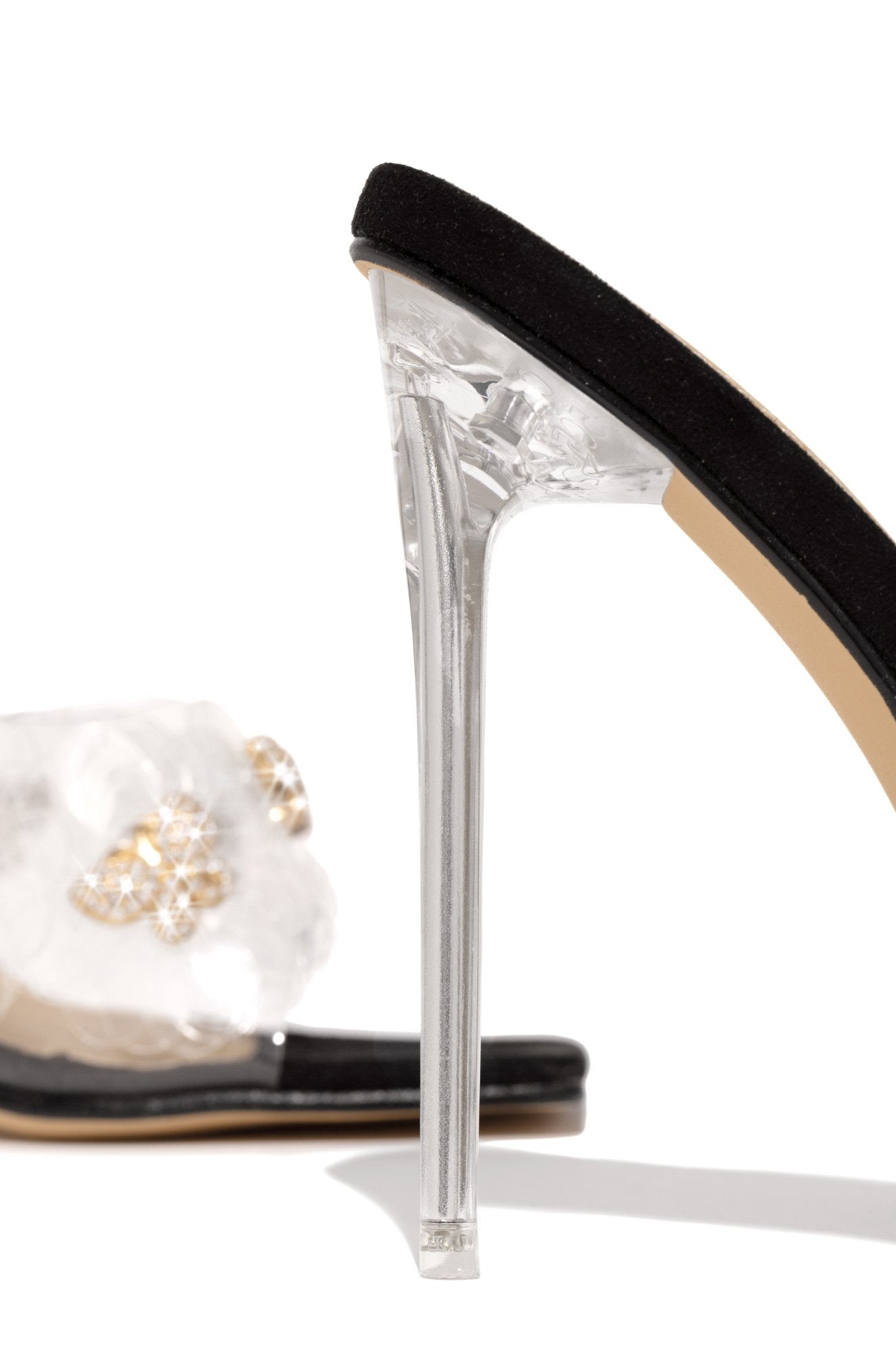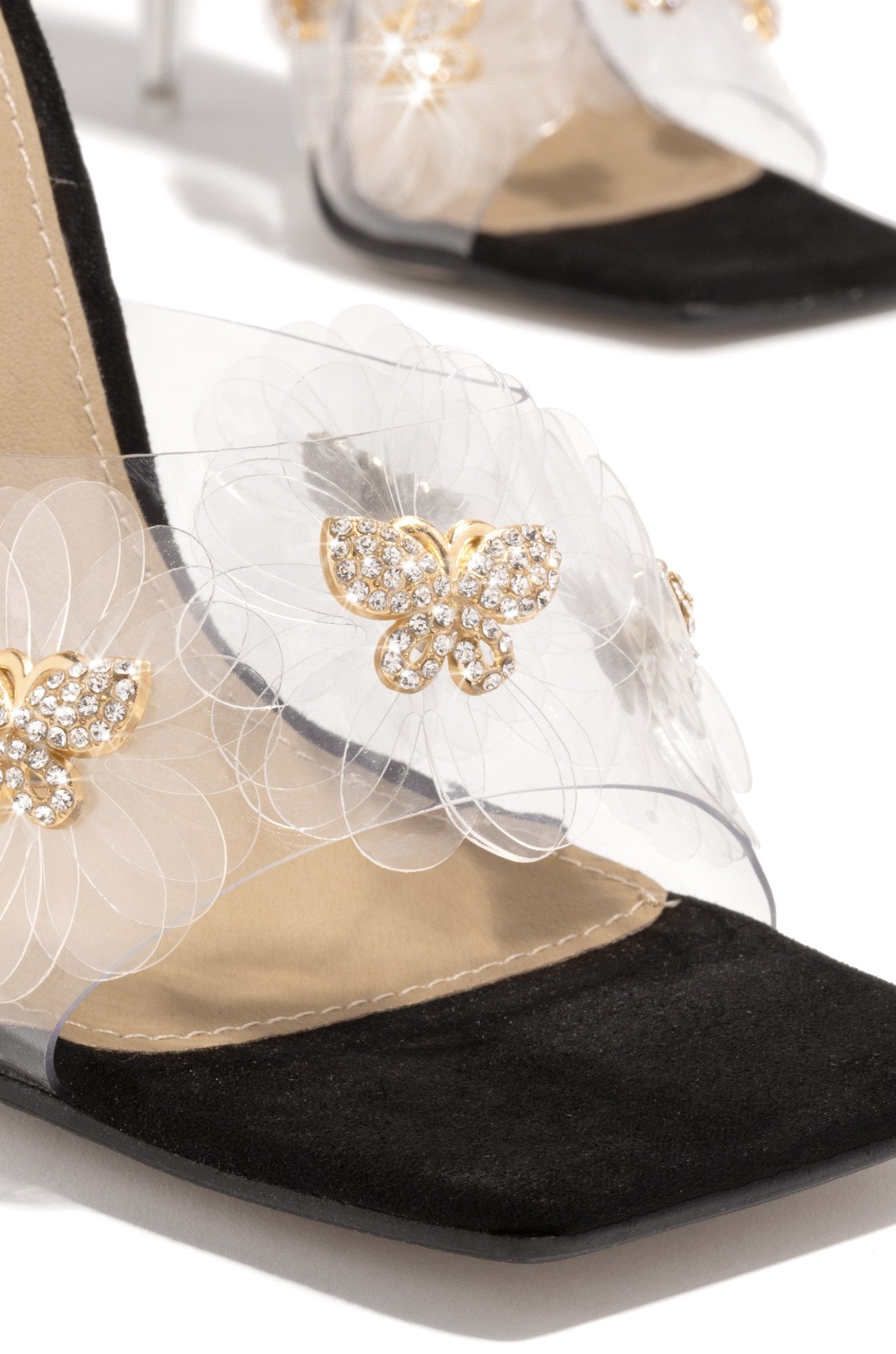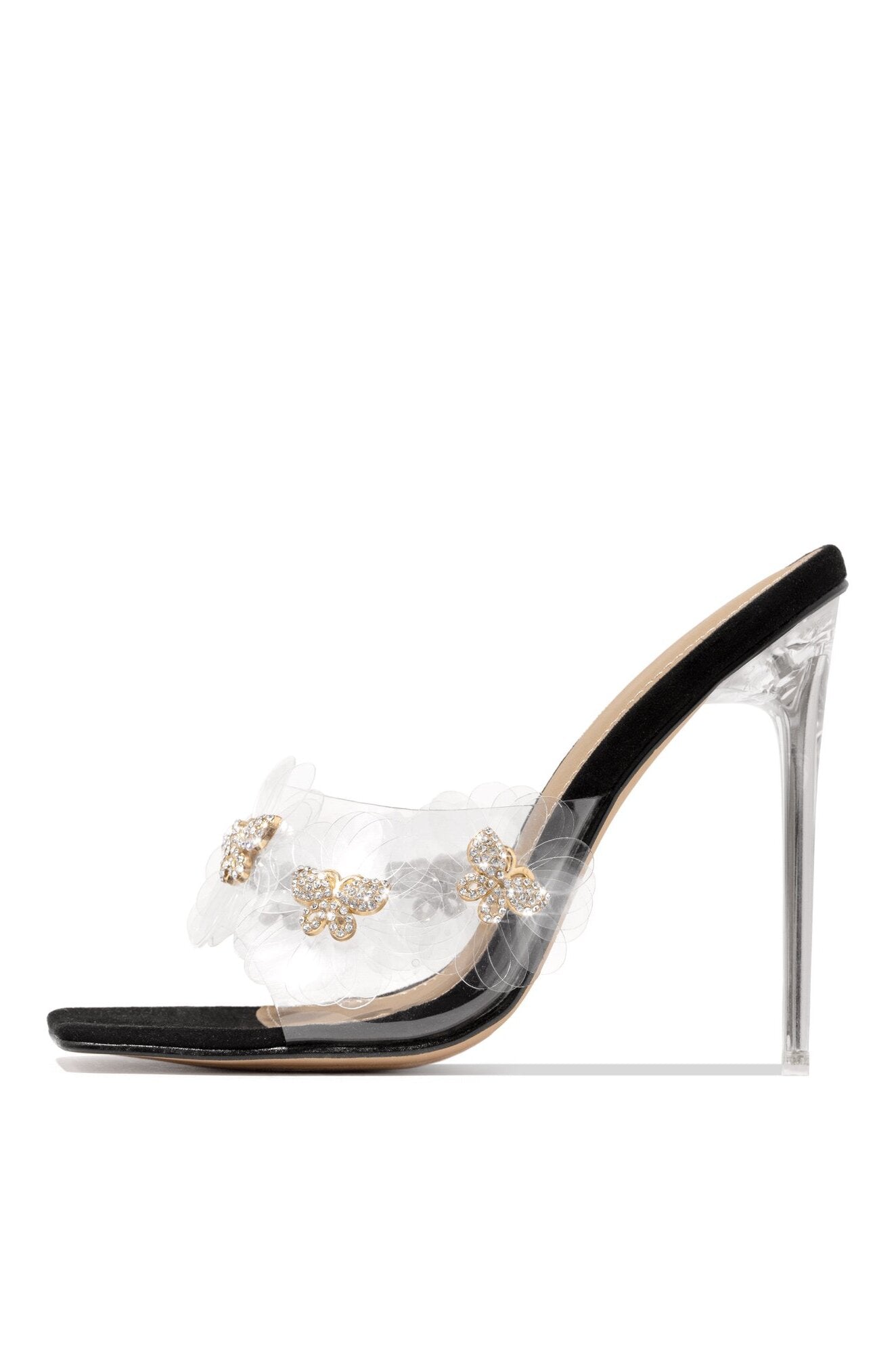 LuxeModa Secret Black Diamond Butterfly Square Peep Toe Heel Clear Pump Mules