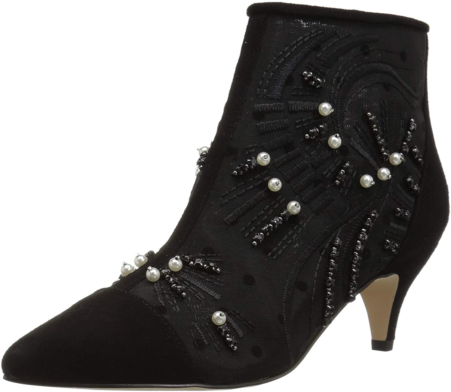 - Kitten heel provides comfort and ability to wear for long periods of time Pearl and stud embellishment offering a fashionable update to a classic kitten heel bootie