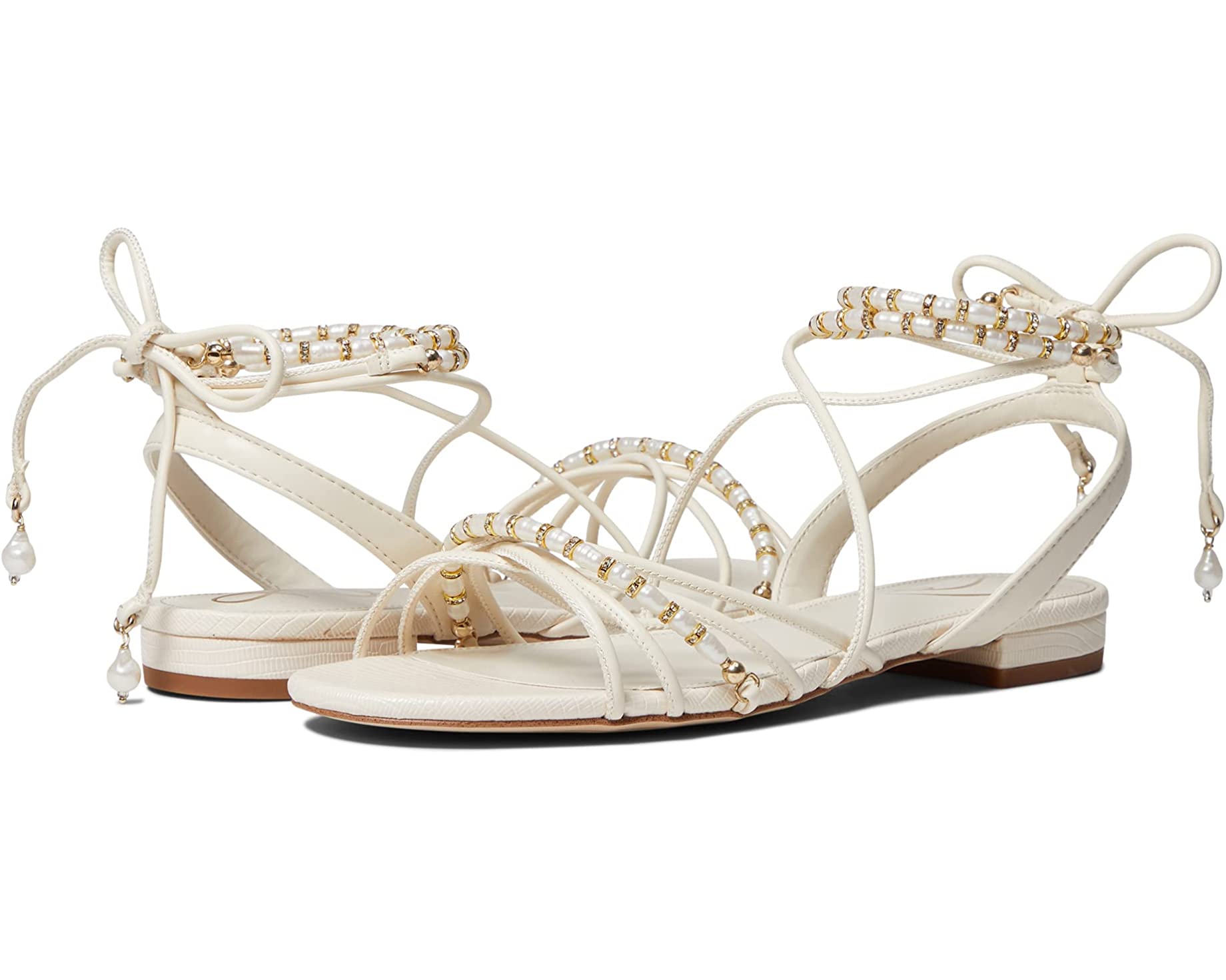 - Strappy upper embellished with beads and shimmery hardware.