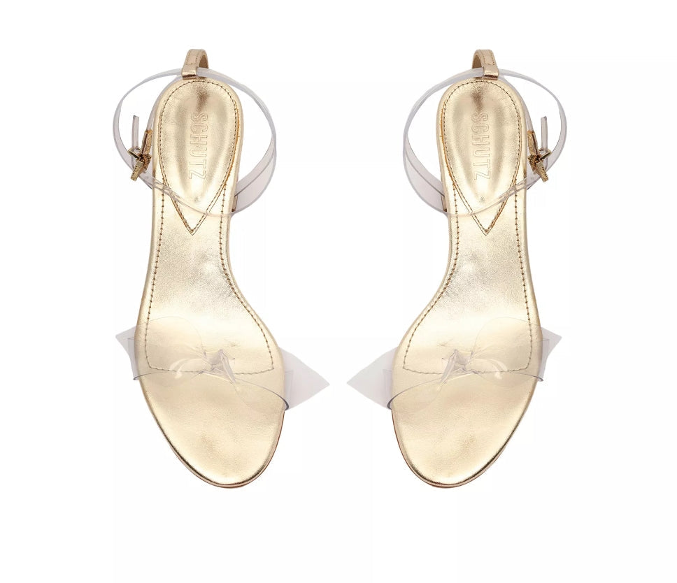 Schutz Elyda Mid Gold Bow Tie Vamp Ankle Strap Open Toe Block Heel Sandals