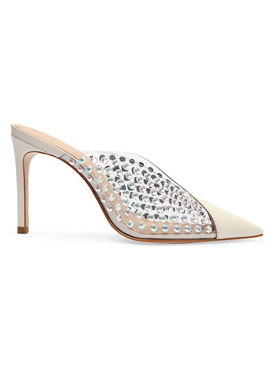 - The Greece Vinyl & Crystals Pumps features a modern mix of vinyl and leather, plus a sprinkling of studs, making it a stylish and unique addition to any shoe collection.