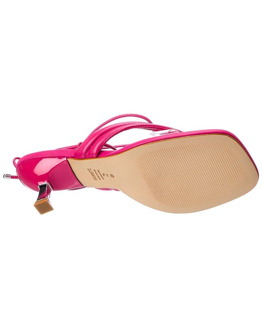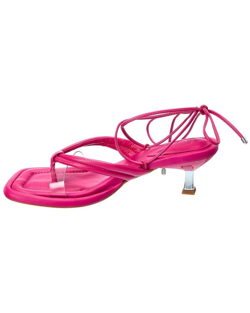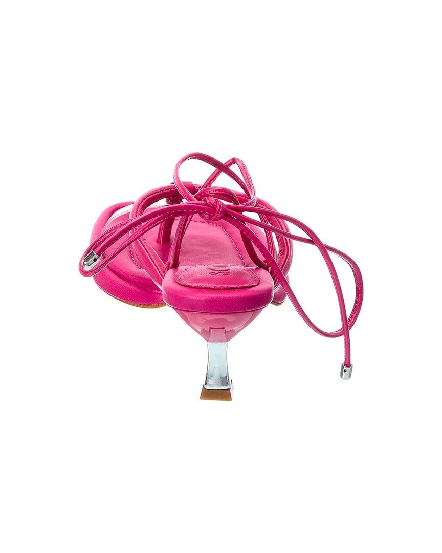 Sleek laces wrap up the ankle of a striking sandal distinguished by a translucent vamp strap and lofted by a contemporary flared heel.