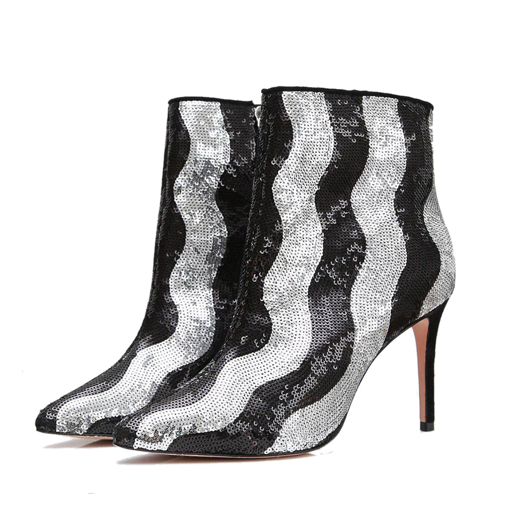 Schutz Tammy Heeled Black Silver Sequin Fashion High Heel Pointed Disco Booties