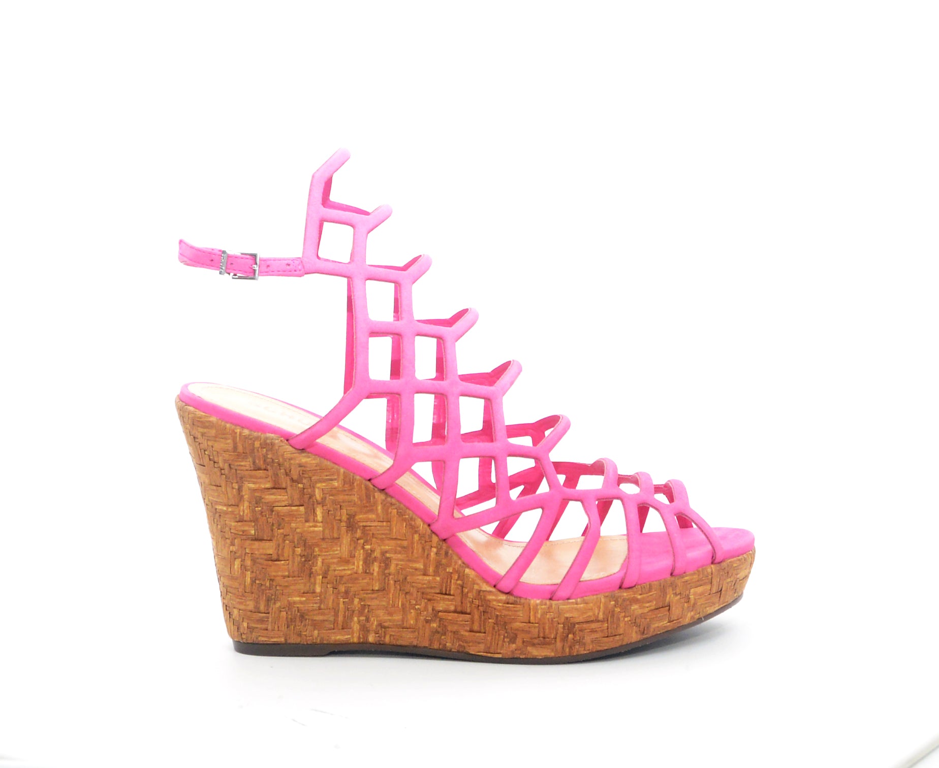 This Marilynn open toe pink espadrille with caged upper and espadrille bottom must be yours!