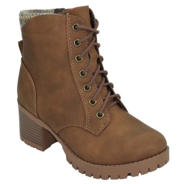 Soda Single Light Brown Lug Sole Chunky Heel Lace Up Platform Combat Ankle Boots