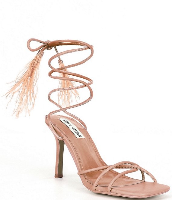 Steve Madden Bryden Tan Lace Up Open Toe Feather Detailed Stiletto Heeled Sandal