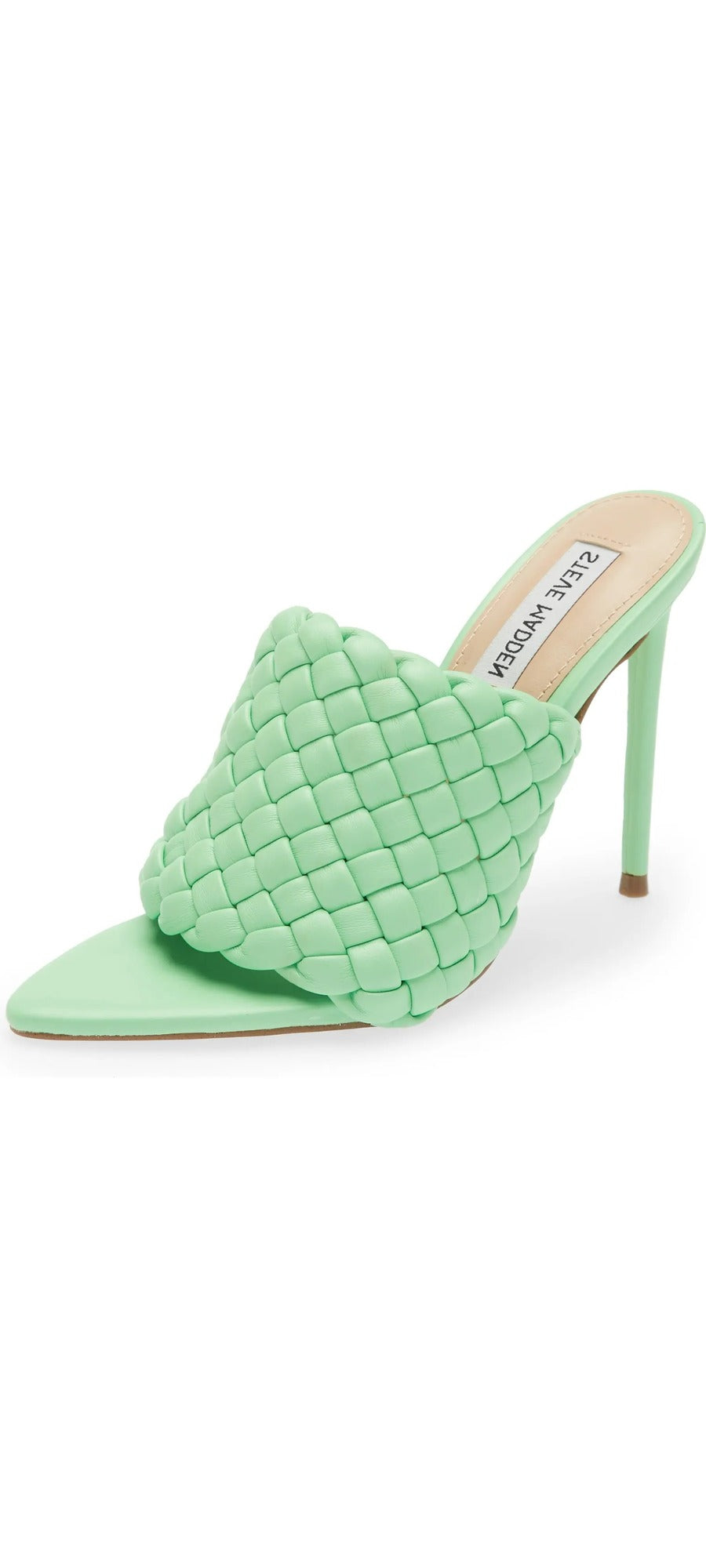 An of-the-moment woven vamp brings touchable texture to a sleek sandal framed by a pointy toe and towering stiletto heel.